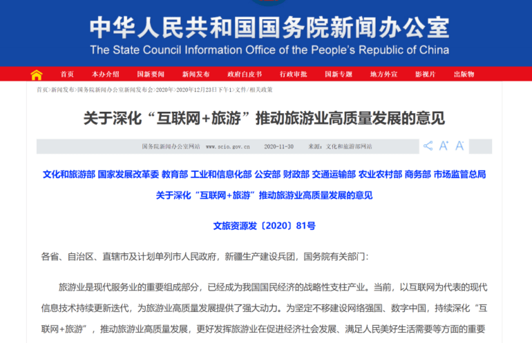 2020年11月30日,国家发展改革委等十部门联合印发《关于深化“互联网+旅游” 推动旅游业高质量发展的意见》,鼓励以数字赋能旅游业高质量发展,推动旅游行业与更多行业融合。