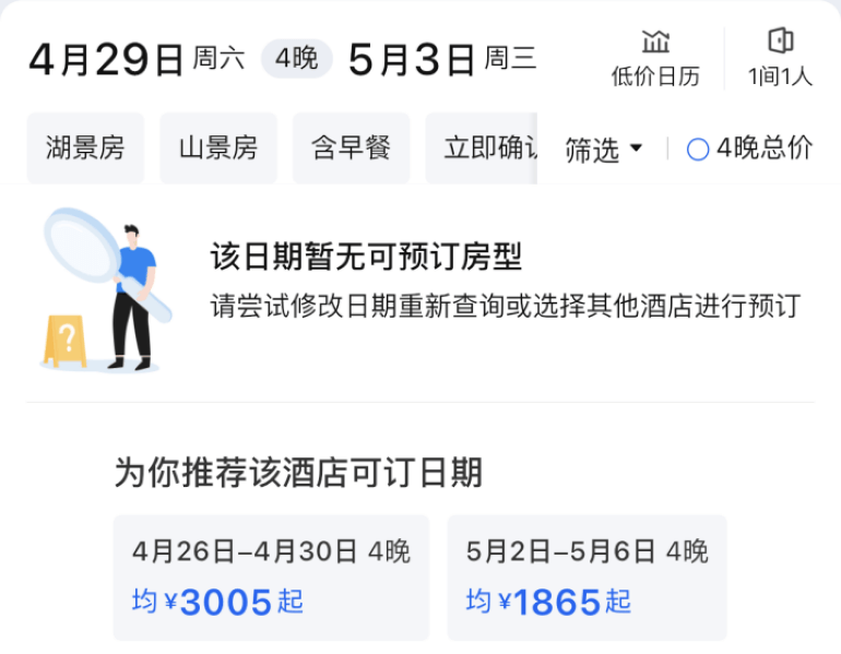 根据携程数据,目前五一假期境内酒店市场搜索热度已达2022年同期9倍以上,相较2019年同期增长近200%;“五一”假期首日(4月29日),北京天安门、南锣鼓巷,上海外滩、迪士尼度假区,长沙五一广场及重庆解放碑步行街附近均有酒店显示满房。