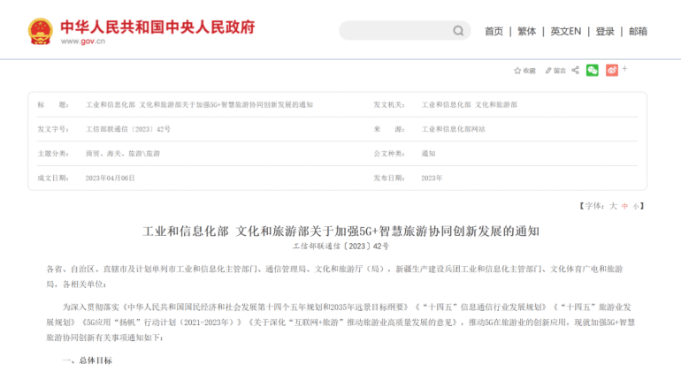2023年4月11日,工业和信息化部、文化和旅游部发布《关于加强5G+智慧旅游协同创新发展的通知》,推进5G+智慧旅游相关行业标准,预计培育一批5G+智慧旅游解决方案供应商,落地30个5G+智慧旅游应用解决方案。