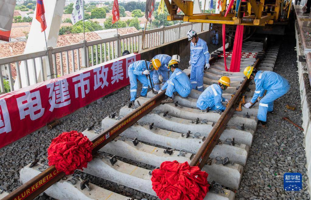 3月31日,在印度尼西亚雅加达雅万高铁哈利姆车站,工人铺设雅万高铁全线最后一根钢轨。雅万高铁全线轨道铺通仪式3月31日在印度尼西亚首都雅加达举行,这标志着雅万高铁全线铺轨完成,为高质量开通运营奠定了坚实基础。新华社发(中国铁路国际有限公司供图)
