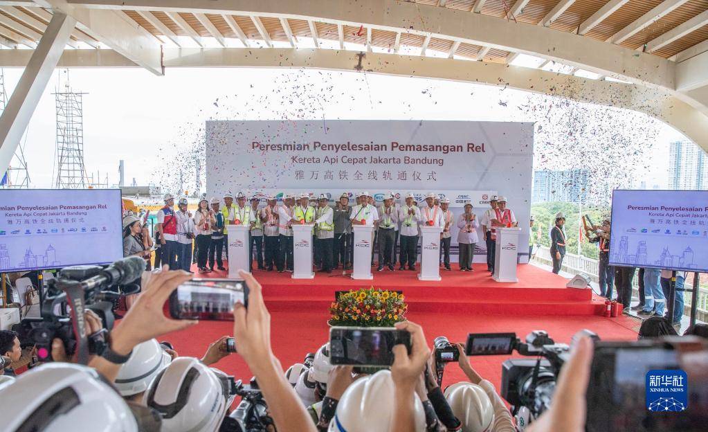 这是3月31日在印度尼西亚雅加达雅万高铁哈利姆车站拍摄的雅万高铁全线轨道铺通仪式。