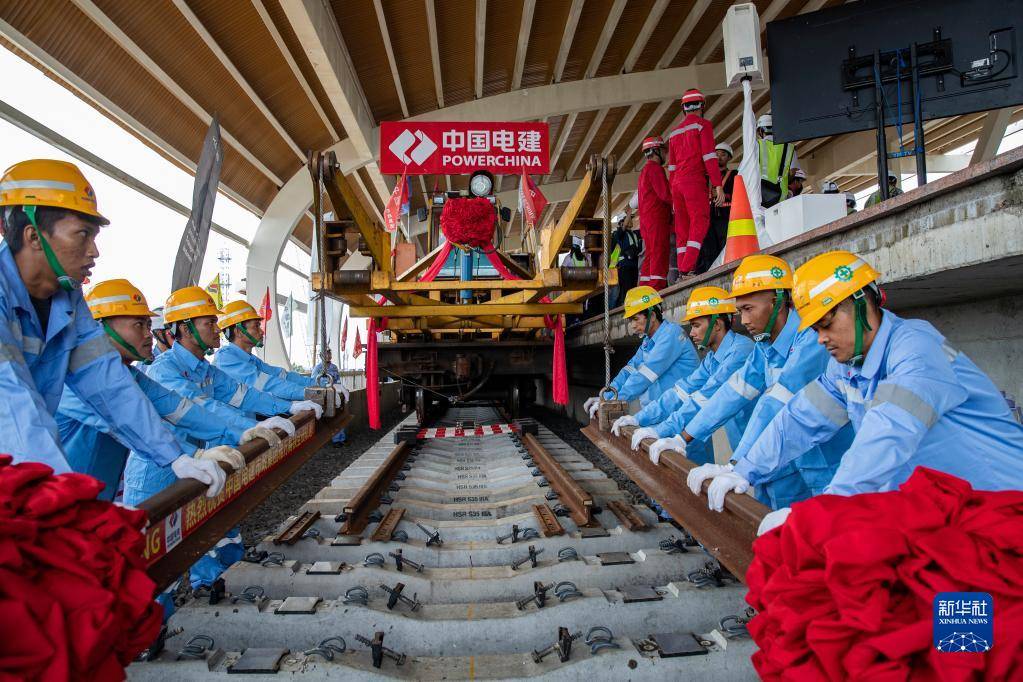 3月31日,在印度尼西亚雅加达雅万高铁哈利姆车站,工人铺设雅万高铁全线最后一根钢轨。