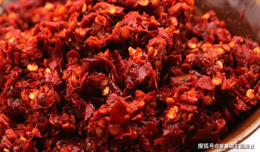 ④随后将刚刚切好的辣椒和泡好的香料全部倒入热牛油中,不断地翻炒,再加上豆瓣、豆豉等其余材料,翻炒10分钟后,加入少量甜白酒和白酒,直到香味全部散出即可关火。