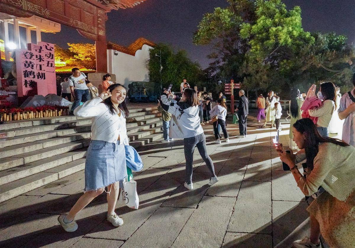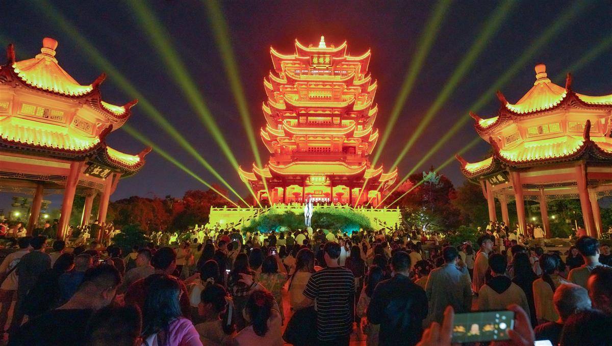 夜色渐浓,武汉的深厚文脉在夜色中闪耀。游客们与千年名楼共赏声色流光,观三镇夜景,览四岸风光,欢度五一假期。