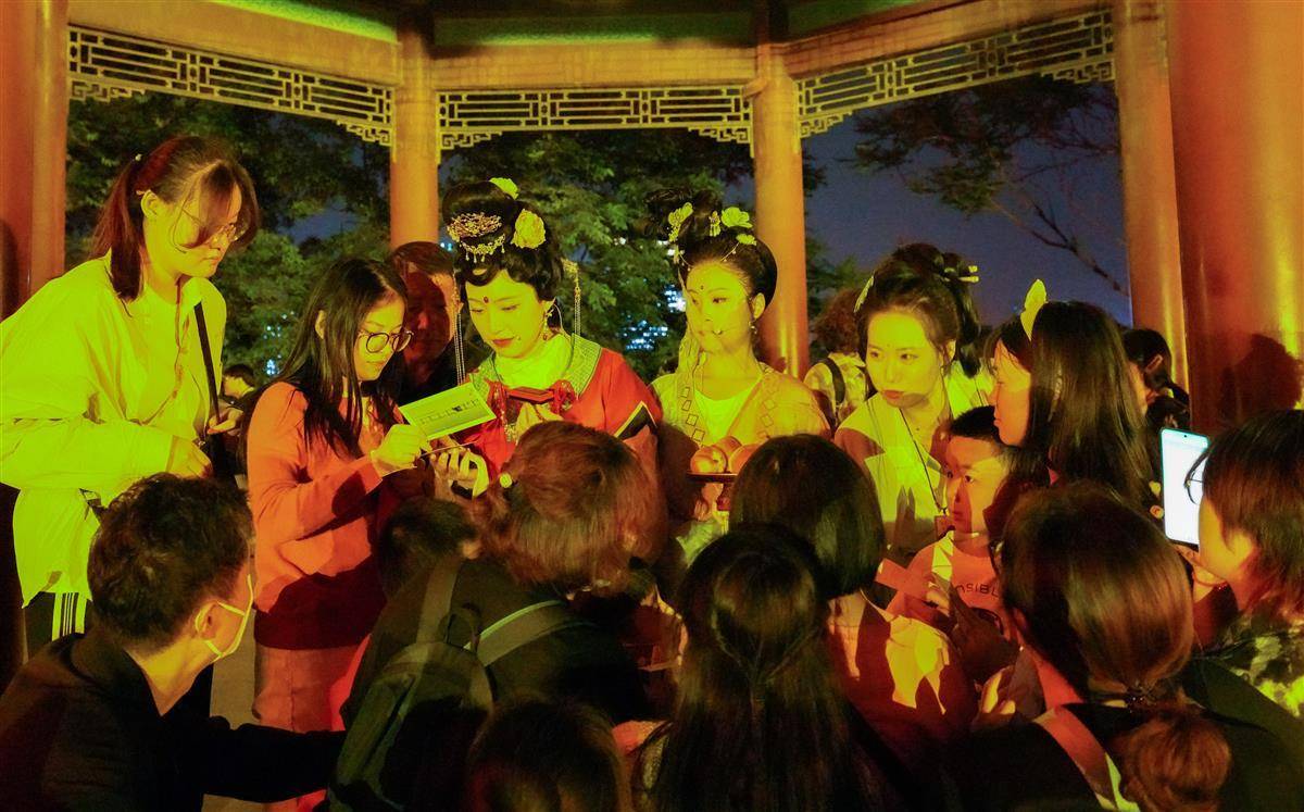 值得一提的是,当晚演出沿途分别安排了“飞花令”和集邮盖章环节,游客们在鹅池、主广场和西门等处,或可盖章打卡兑换礼品,或可参与诗词互动,边游边观歌舞边玩不亦乐乎。在动感光影中,惟妙惟肖的八仙真人演艺和实景互动,将夜晚的黄鹤楼变成了一幅活灵活现的神仙画卷。