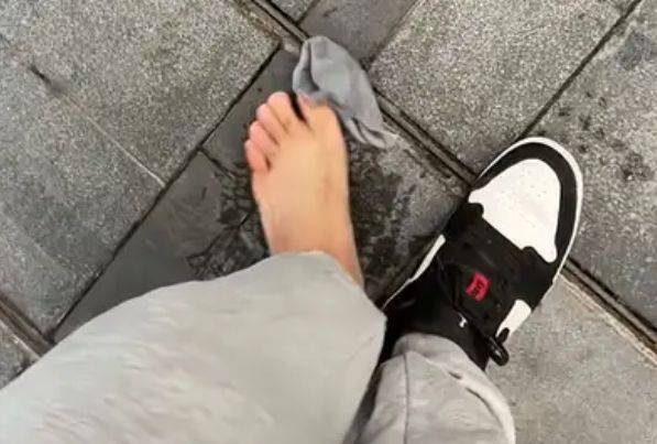 视频中,男子一只脚上挂着袜子,鞋子却不见了。