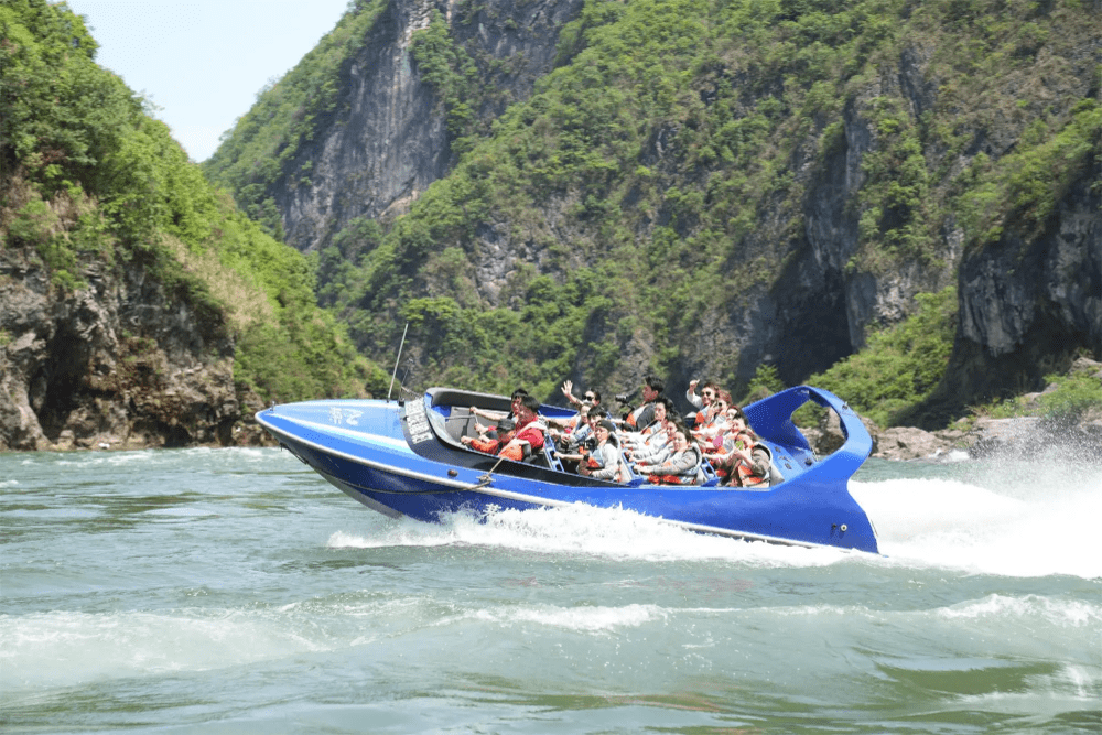 张家界茅岩河漂流,全长约20公里,落差66米,上游可以自助漂,在随性、自由间,充分体验亲水之乐;下游是动力漂,河道滩连滩,浪挽浪,在峡谷中穿梭,穿石绕壁,追波逐浪,时而被软若无骨的河水抛上浪尖,时而又被河水牵扯着跌入浪谷,尖叫和呐喊此起彼伏。此外,在这里,游客还可体验国内首个高山峡谷喷射快艇。其最高时速可达80km/h,可做蛇形、水面原地360度旋转飘移、急停等多项特技,有着道不尽的惊险和刺激。