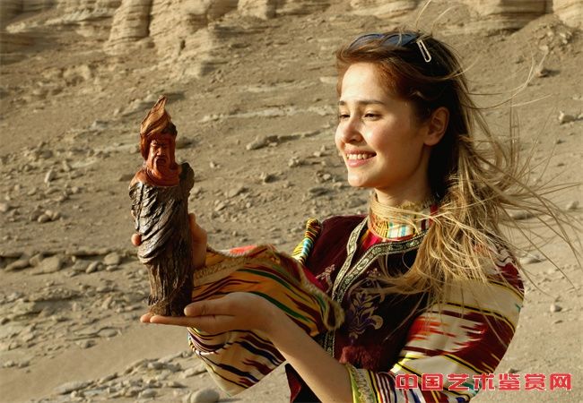 图 丝绸古道新疆姑娘莱孜乃在罗布泊捧着关帝木雕像 朱正明摄影