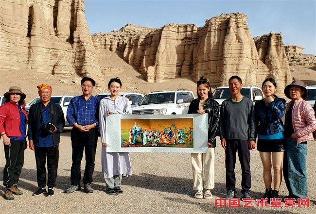 图 在新疆罗布泊大漠朱正明(左三)一行展示《中华关帝图》。右三为探险家、摄影艺术家保哥 香港陈长年摄影