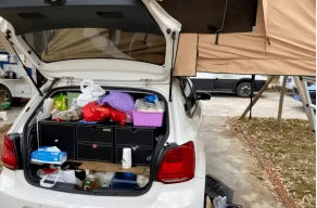苏敏的汽车后备箱放置着出行物资