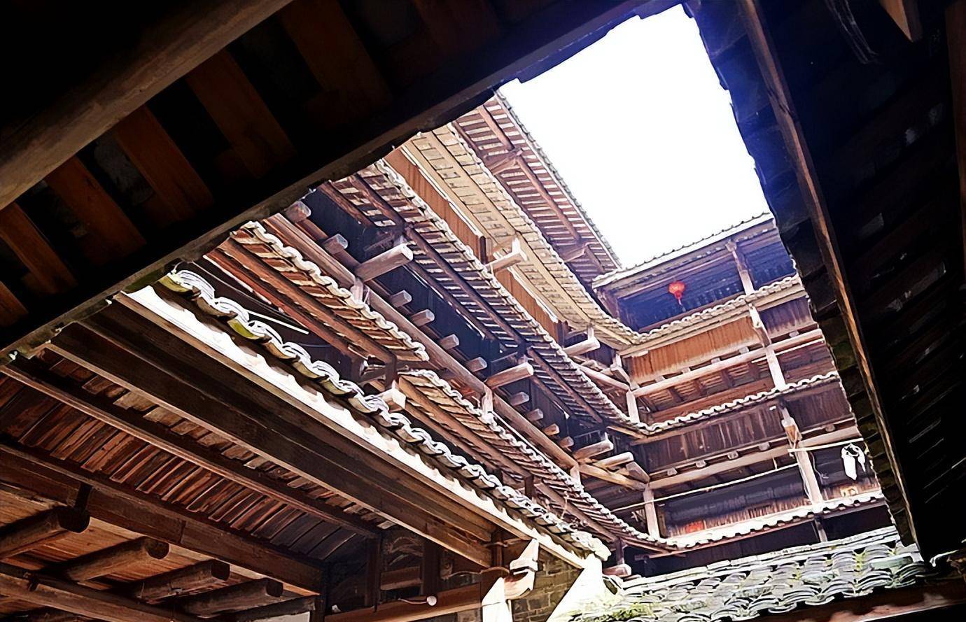 踏着咚咚作响的木楼梯上楼,如在空中漫步,有凌空欲飞的奇妙感觉。登上第四层,仰望楼顶,耀眼天光喷薄而下,楼外天光灿烂。环视土楼,俯视层楼,古香古色,深邃幽静,仿佛置身天外,又似深潜地宫。