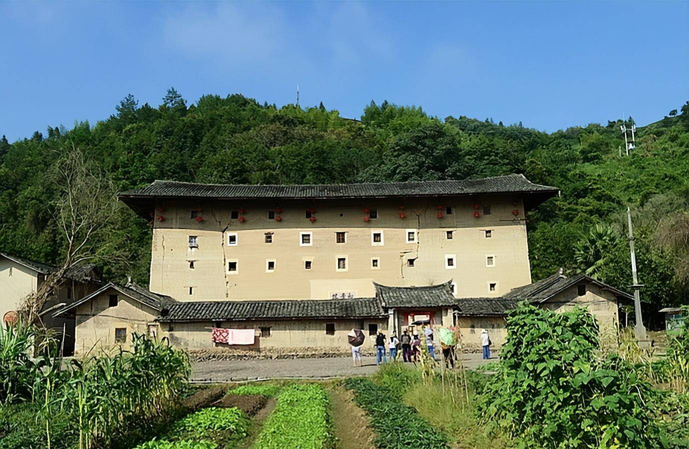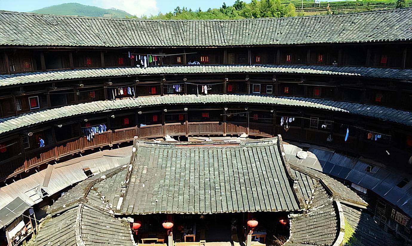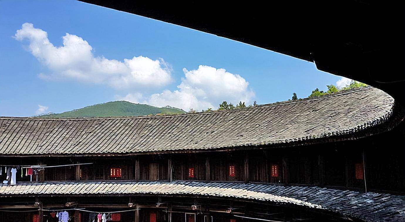 土楼顶覆盖着一圈青瓦屋檐,用以遮挡雨淋。这松散的泥土如何能承受如此高的楼体,而且百年不坏?人们真佩服古人的胆识和智慧。楼体有一些小小的窗户,似乎是为了透光。土楼只有一个门,门道不宽,可以容几人并行。闽南人为什么要建这样的土楼,而且楼体设置得很高?