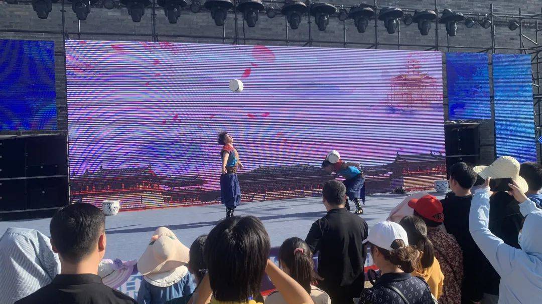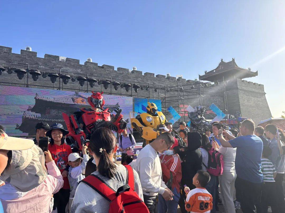 二虎广场上又潮又酷,身高近3米的大型机甲亮相,吸引游人合影,杂技演员徒手高空抛杠,科技怪咖秀拉满现场的欢乐值,国风舞蹈、古筝solo秀、陕普乐队、秦腔等为游客带来一场视听盛宴。