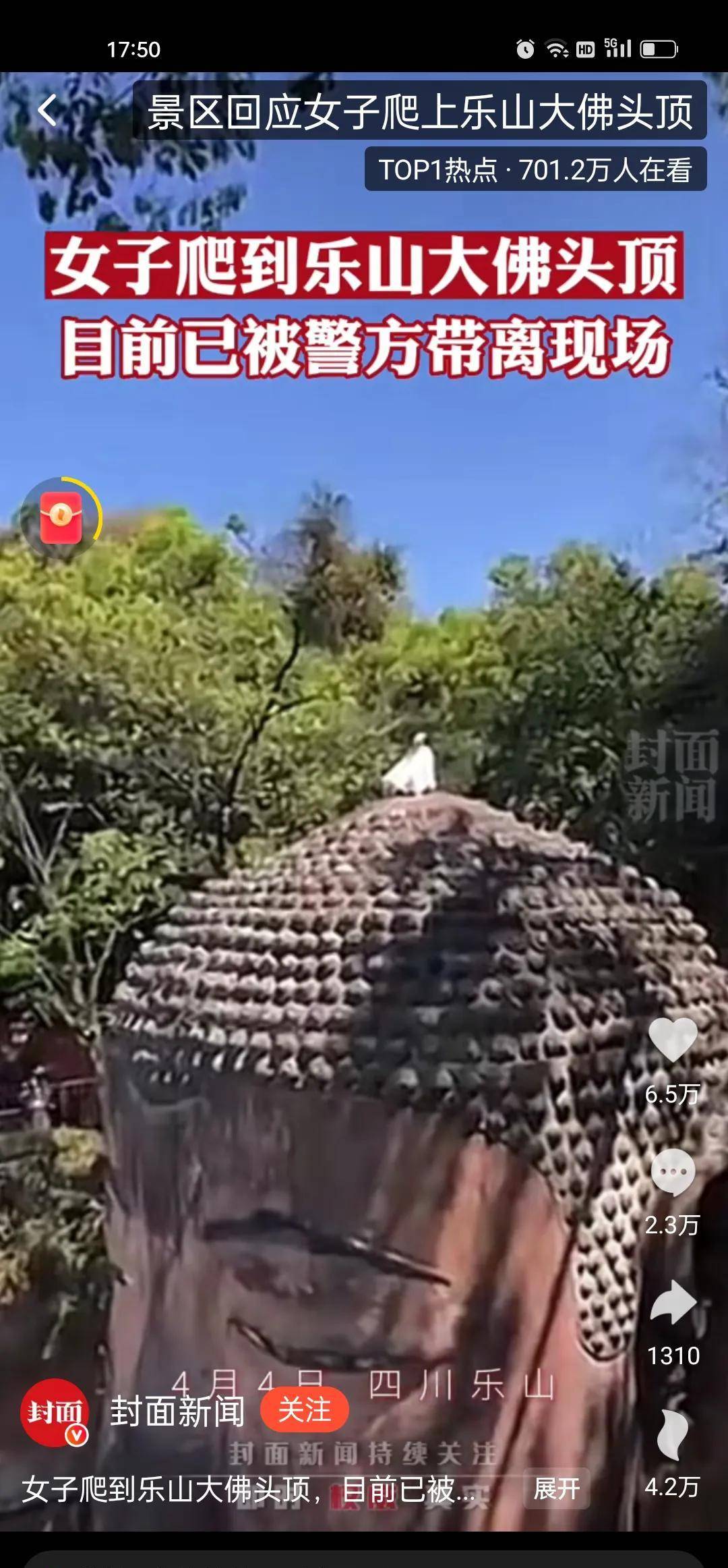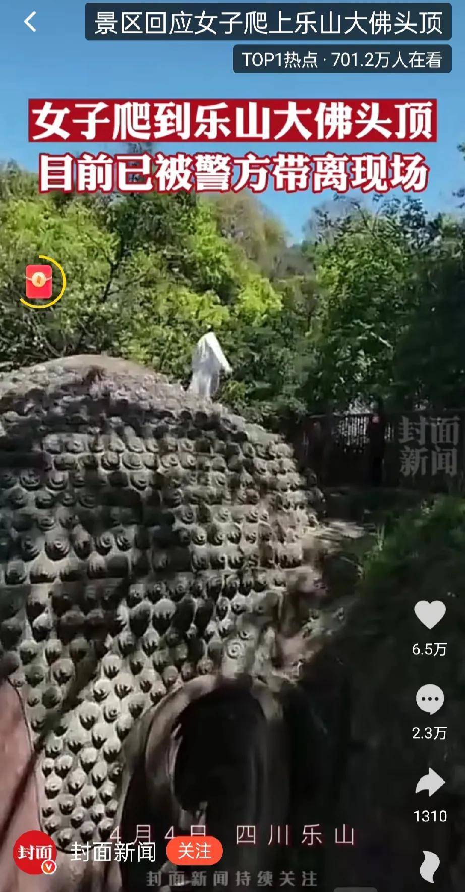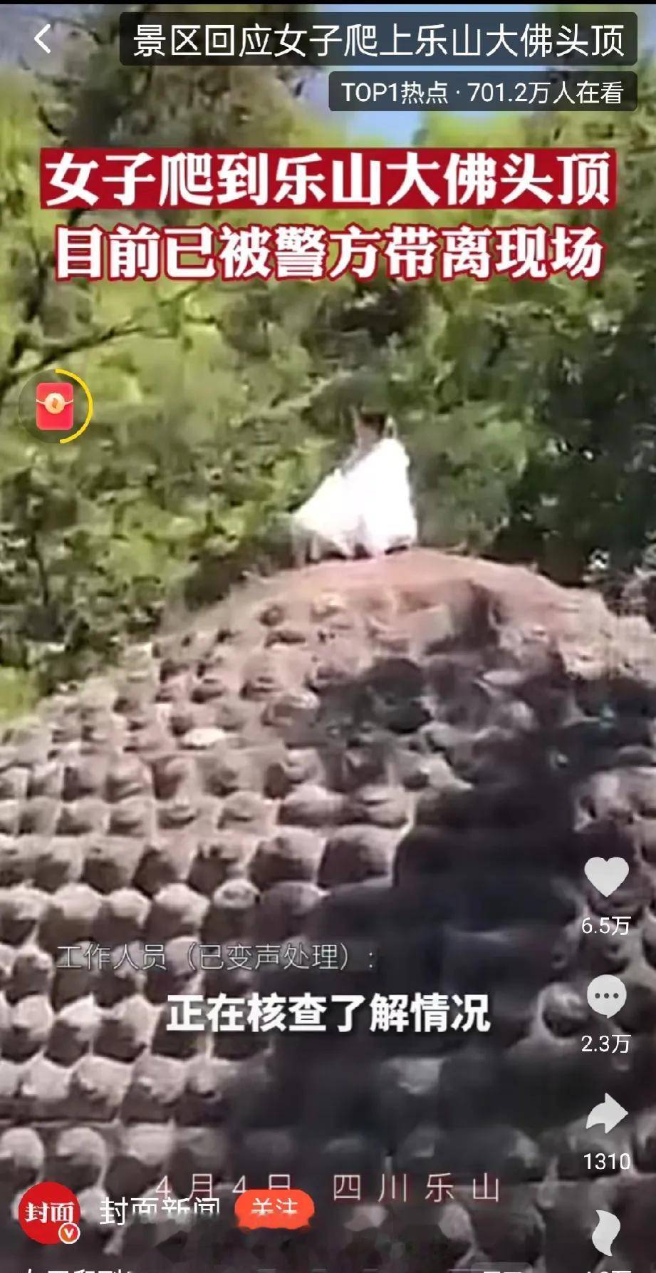 4月4日,有网友拍了一则四川乐山大佛的视频发布到短视频平台,视频中一名白衣女子肆无忌惮地爬上了大佛头部,到了头顶处她停下来打坐,此事上了头条热榜,引发网友热议。有媒体为此进行了采访,景区工作人员证实确有此事,并直言该女生可能是精神方面出了问题,现在人已被带走。