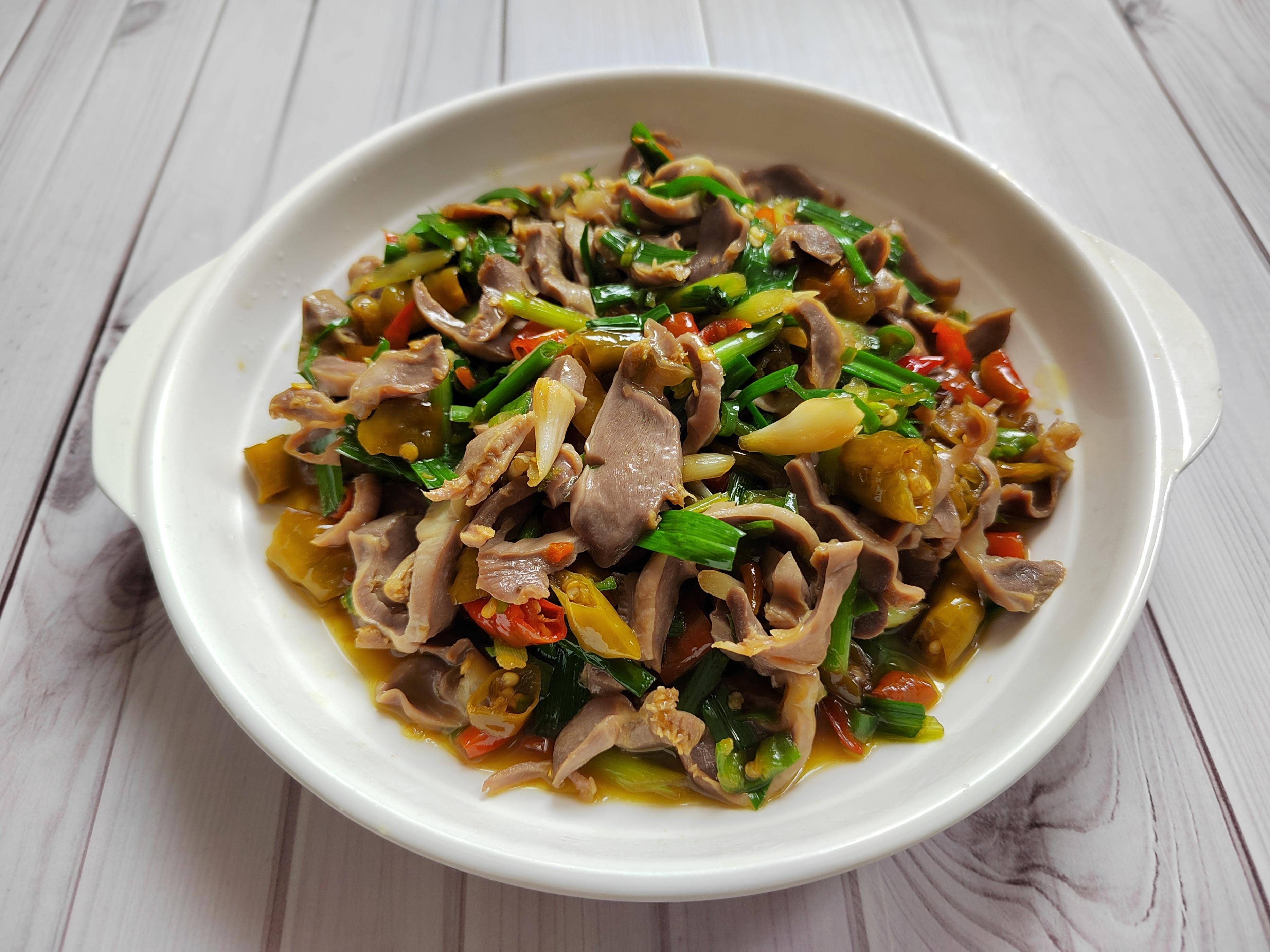 鸡胗腥味重,洗干净后,还得加些葱结、姜片、料酒焯水,去除腥味。鸡胗焯水后,冲洗干净,再切成薄片,这样更容易入味。起锅烧油,放入大蒜梗和酸辣椒爆炒一会儿,再放入鸡胗继续爆炒,淋入一圈料酒去腥,加入盐、生抽和蚝油炒匀,最后放入大蒜叶子翻炒几下,就可以出锅了。