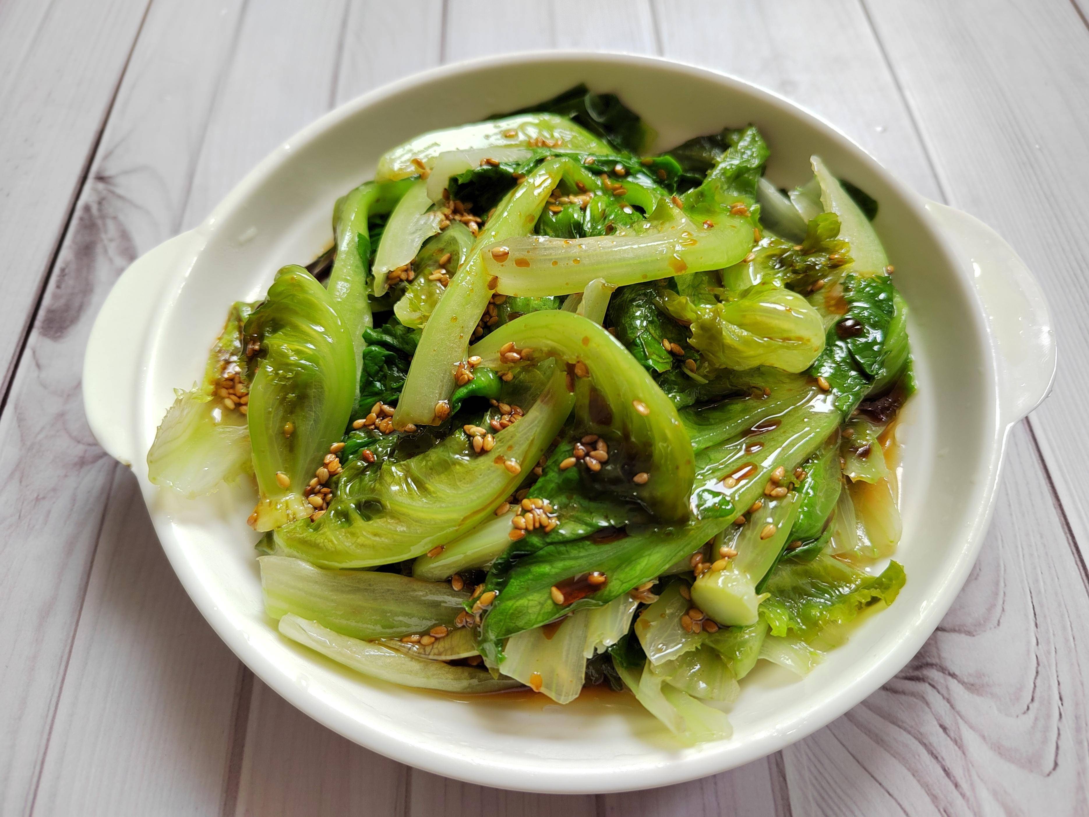 白灼生菜,是广东这边常见的吃法,碗里加些白芝麻、盐、生抽、蚝油和白糖拌匀,淋入加热后的花生油,激发香料的味道。生菜洗净后,放入开水锅中,大火煮至变色后,立马捞出,控干水分装盘,倒入料汁就可以上桌了,简单又开胃!