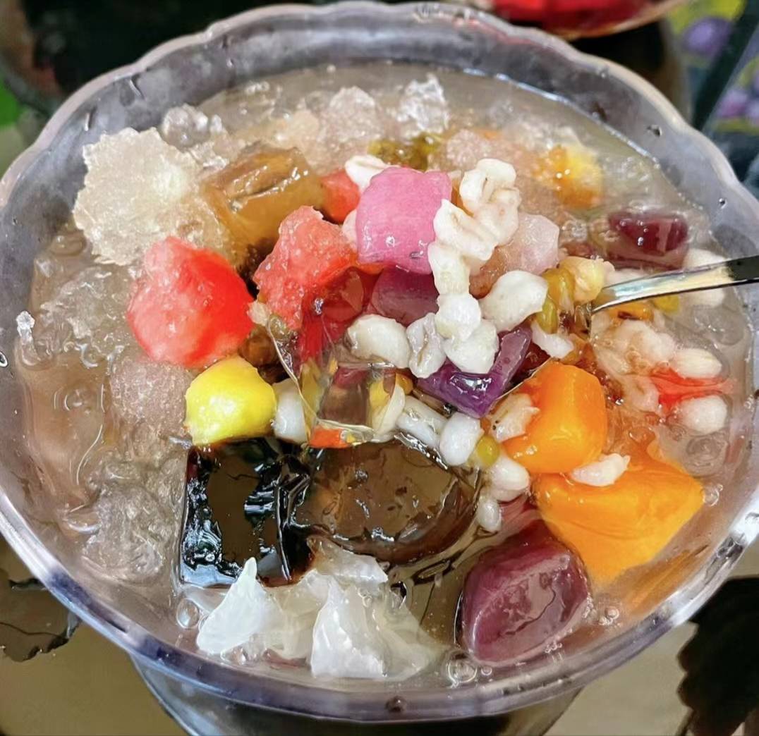 漳州四果汤是四果汤的一种变种,属于福建闽南地区的特色小吃之一。和传统的四果汤相比,漳州四果汤加入了更多的食材,如芋头、西瓜等。制作方法和其他四果汤类似,将各种干果、蜜饯、水果放入锅中煮熟,再加上刨冰或冰水,淋上少许蜂蜜即可。漳州四果汤味道清凉爽口,适合夏季饮用