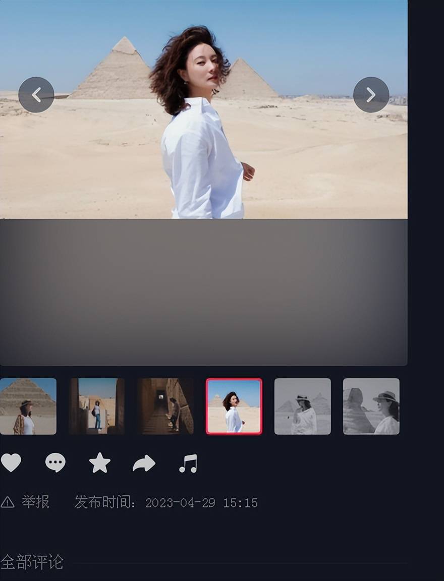 刘芳菲此次是用六张在金字塔留影的照片来合成的这个短视频的,为了让这个短视频更加有韵味,刘芳菲还特意找了一个充满异域风情的埃及音乐,无疑让这个段子锦上添花。站在金字塔内部的通道的刘芳菲宛如一部时尚大片、站在胡夫金字塔面前的黑白照片充满了鲜明的时光对比……古埃及文明和东方美女在某一个时空节点达到了一种超乎地域的融合。