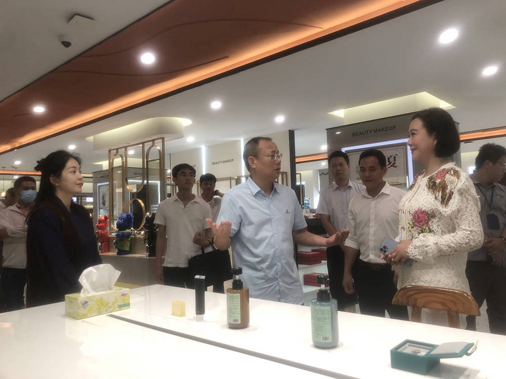 中共定安县委书记刘峰松向店主了解情况。陈磊 摄影