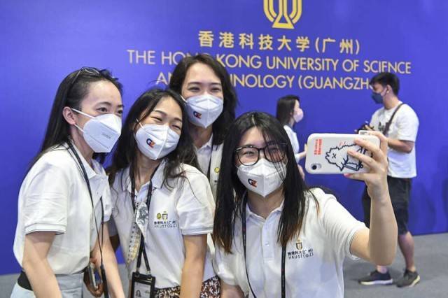 香港科技大学(广州)开学典礼暨校园启用仪式上,合影的年轻人。梁钜聪/摄