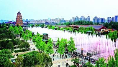 游人在陕西西安大雁塔北广场观看音乐喷泉表演。新华社发