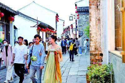 游客在江苏苏州山塘街休闲游玩。新华社发