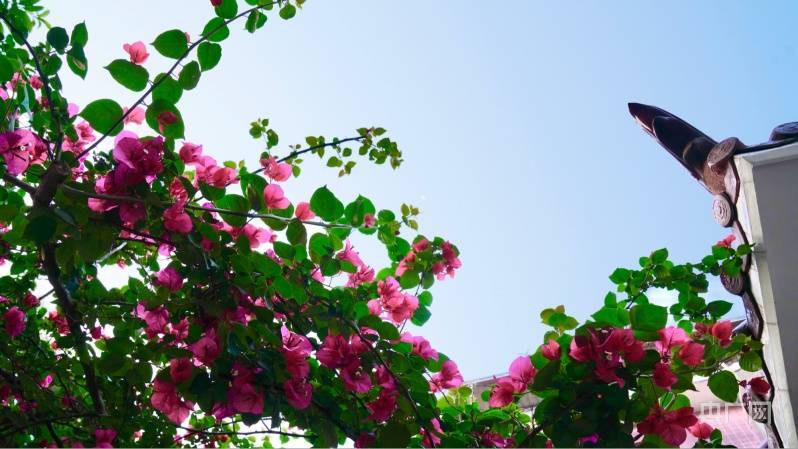 在上犹中学办公楼,三角梅从一楼爬升到三楼,花开成“瀑”墙,犹如一幅花海油画,蔚为壮观。学生们欢快地从瀑布花墙前走过,红艳艳的花朵映衬在学生脸庞上,青春烈焰,意气风发。一簇簇三角梅在阳光的照耀下显得格外艳丽,微风吹过,成串、成片的红色、紫色波浪随风涌动,婀娜多姿,美不胜收,为校园增添了一道道亮丽的风景。