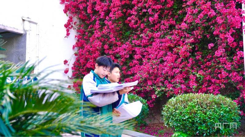 红艳艳的花朵映衬在学生脸庞上,青春烈焰,意气风发(央广网发 王健 摄)