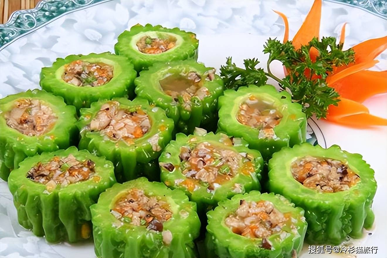 所谓酿菜,是把各种调料加入到肉馅里,然后填入不同蔬菜或壳类做成的“外衣”中,或蒸,或焖,熟而成“酿”。最正宗的十八酿建议去桂林南边的平乐县城。