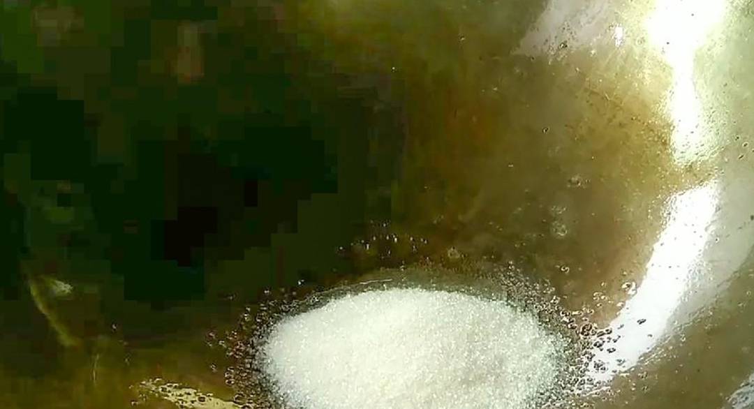 接下来准备一下调料,陈醋4勺,白糖3勺。锅中加入少许油,加入刚刚准备好的白糖来炒一个糖色,开中小火把糖炒至融化。