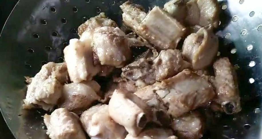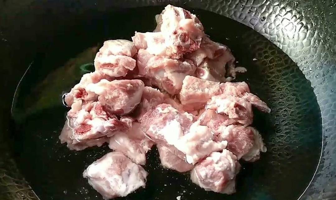 接着我们把买回来的排骨彻底清洗干净,排骨冷水下入锅中,加入姜片和料酒,把上面的浮沫撇出去不要,焯水5分钟后就可以捞出了,最后捞出后把排骨控一下水。