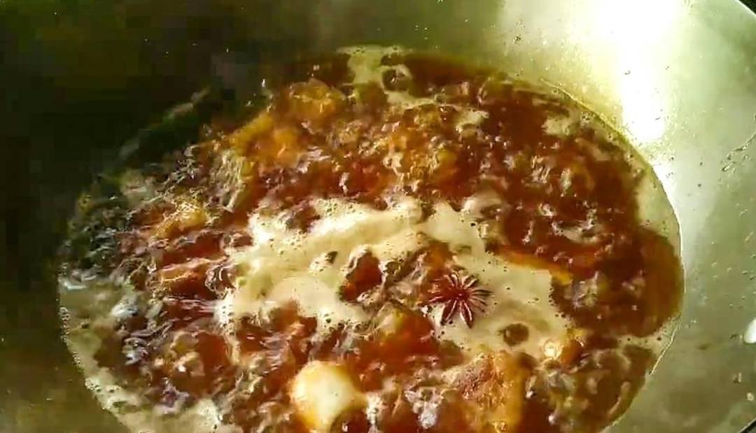 糖色熬到枣红色时加入排骨,把排骨都均匀地炒至上色,排骨上色后加入八角、姜片翻炒出香味,然后加入1勺料酒,1勺陈醋,2勺生抽。