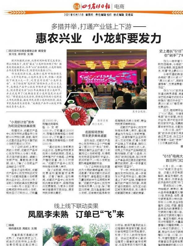 “通过实施小龙虾惠农兴业计划,在带给市民更多优质小龙虾的同时,促进上游养殖户扩大销路,让养殖户增收致富,助力乡村振兴。”成都农产品中心批发市场相关负责人表示。