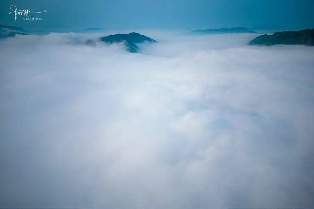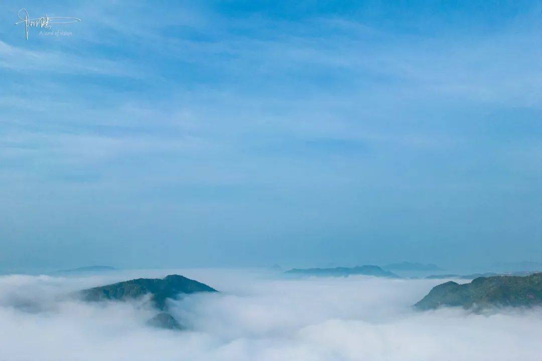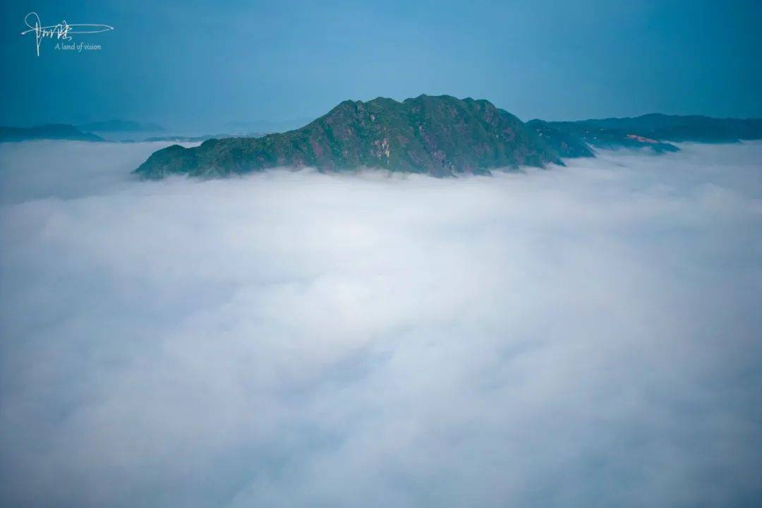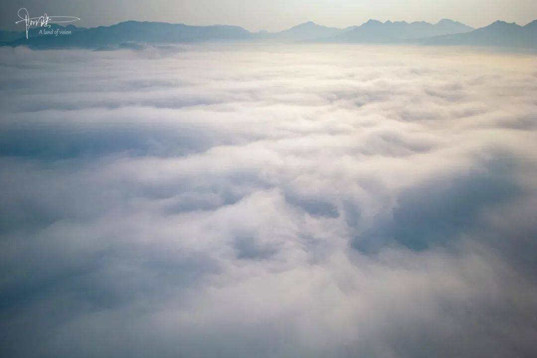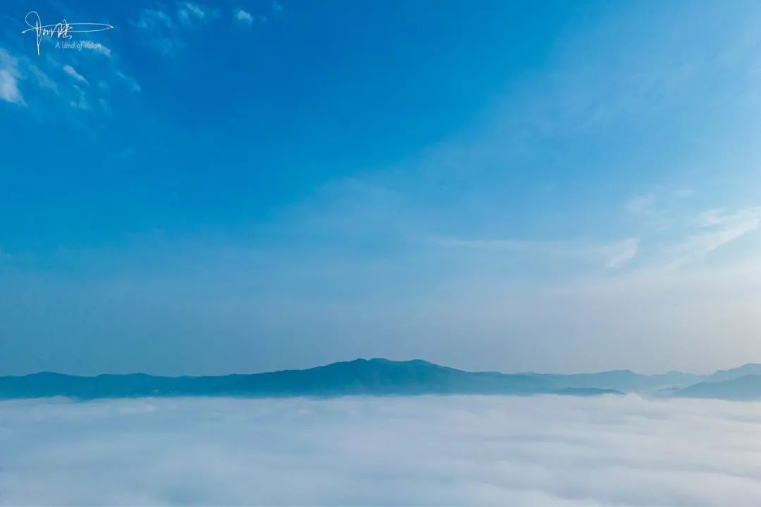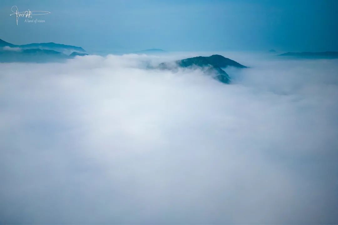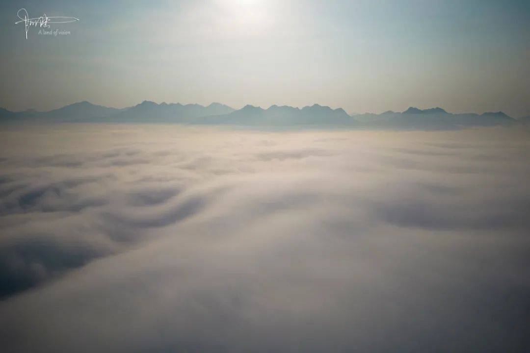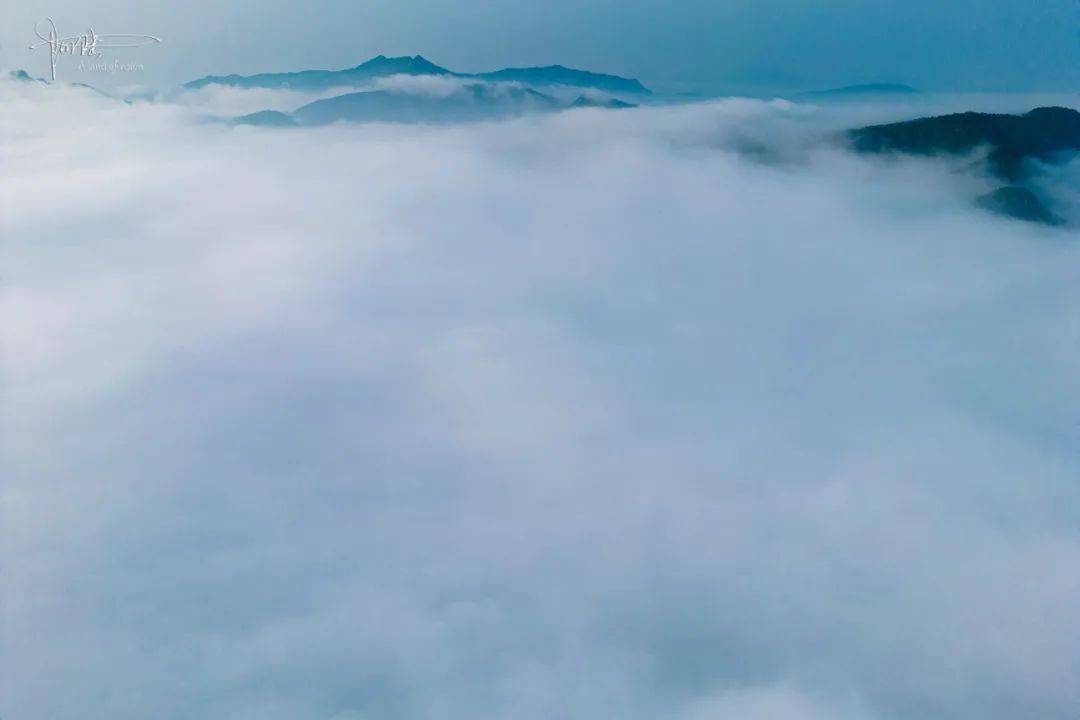 无人机才往上飞了400多米,就穿出略显“厚重”的白雾茫茫,不禁让人眼前一亮,展现在镜头中的竟然是一副浩浩荡荡奔涌如潮的云海奇观。而四周群山中的高个子,纷纷探露出头角,形似岛屿,更给画面增添了几分“蓬莱仙境”般的感觉。