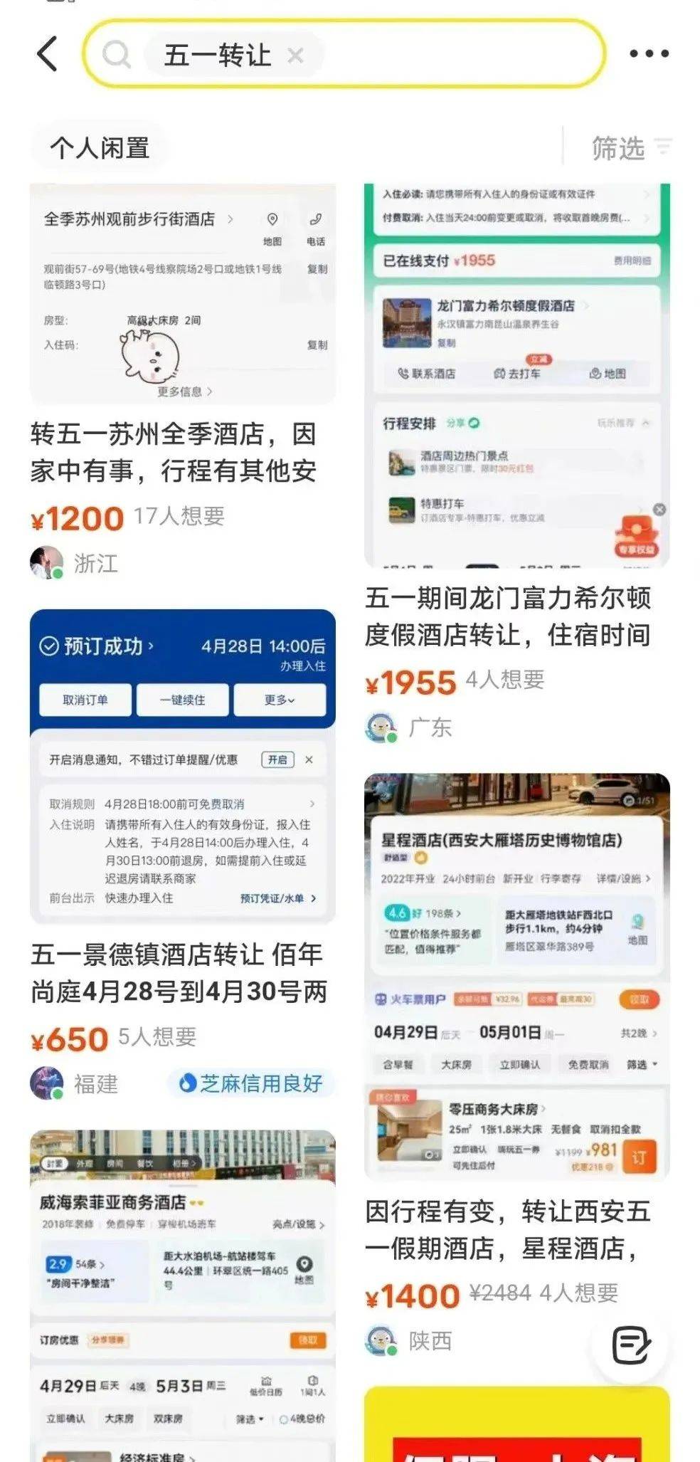 “五一”期间酒店客房价格狂飙,二手交易平台、社交平台成为不少人捡漏的地方。