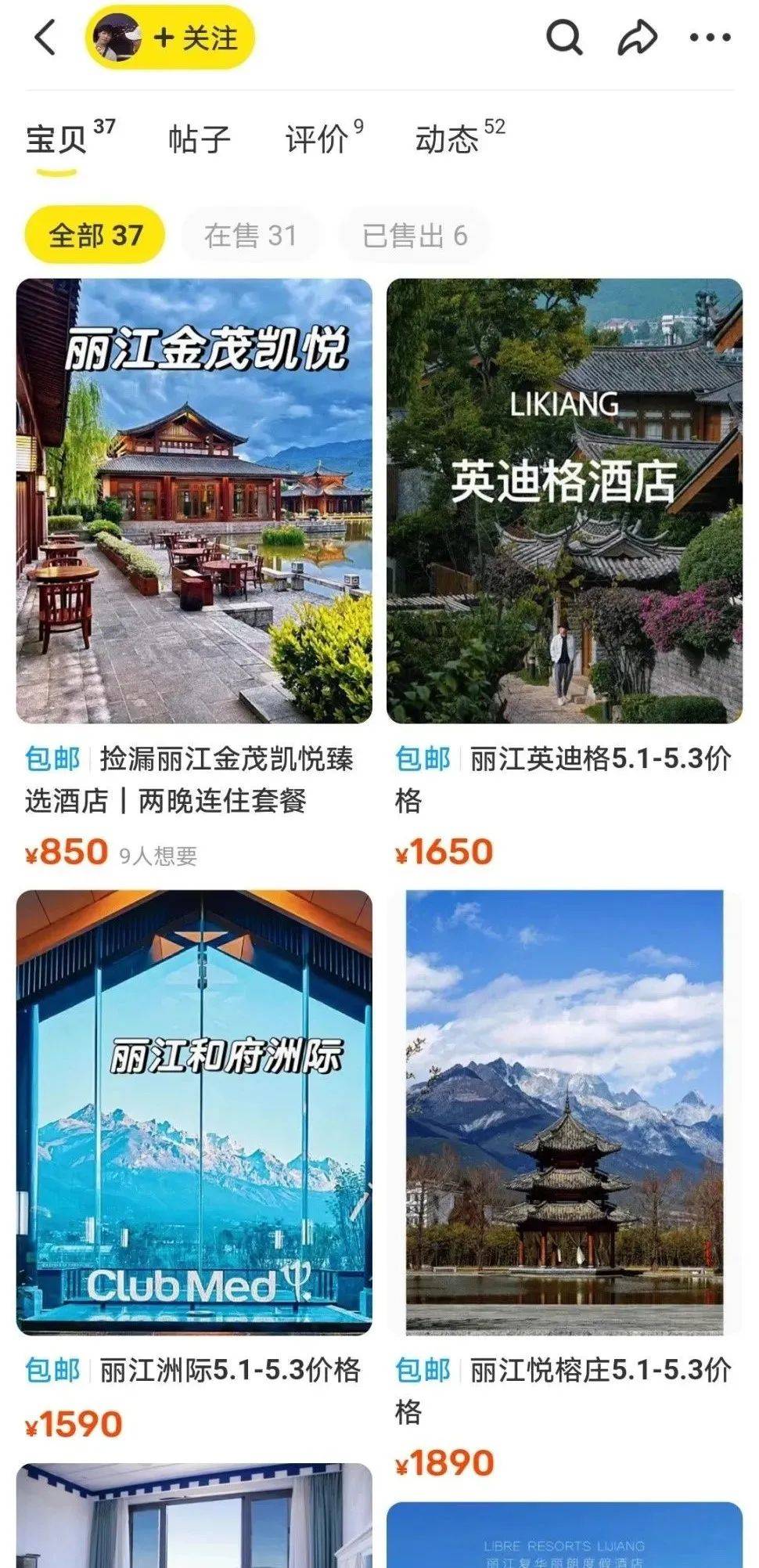 李伟(化名),云南某旅行社“旅行定制师”,号称专业做“定制旅游”8年。他的账号主页在售有云南31家连锁酒店的客房,且前几套都表明这个假期有客房。