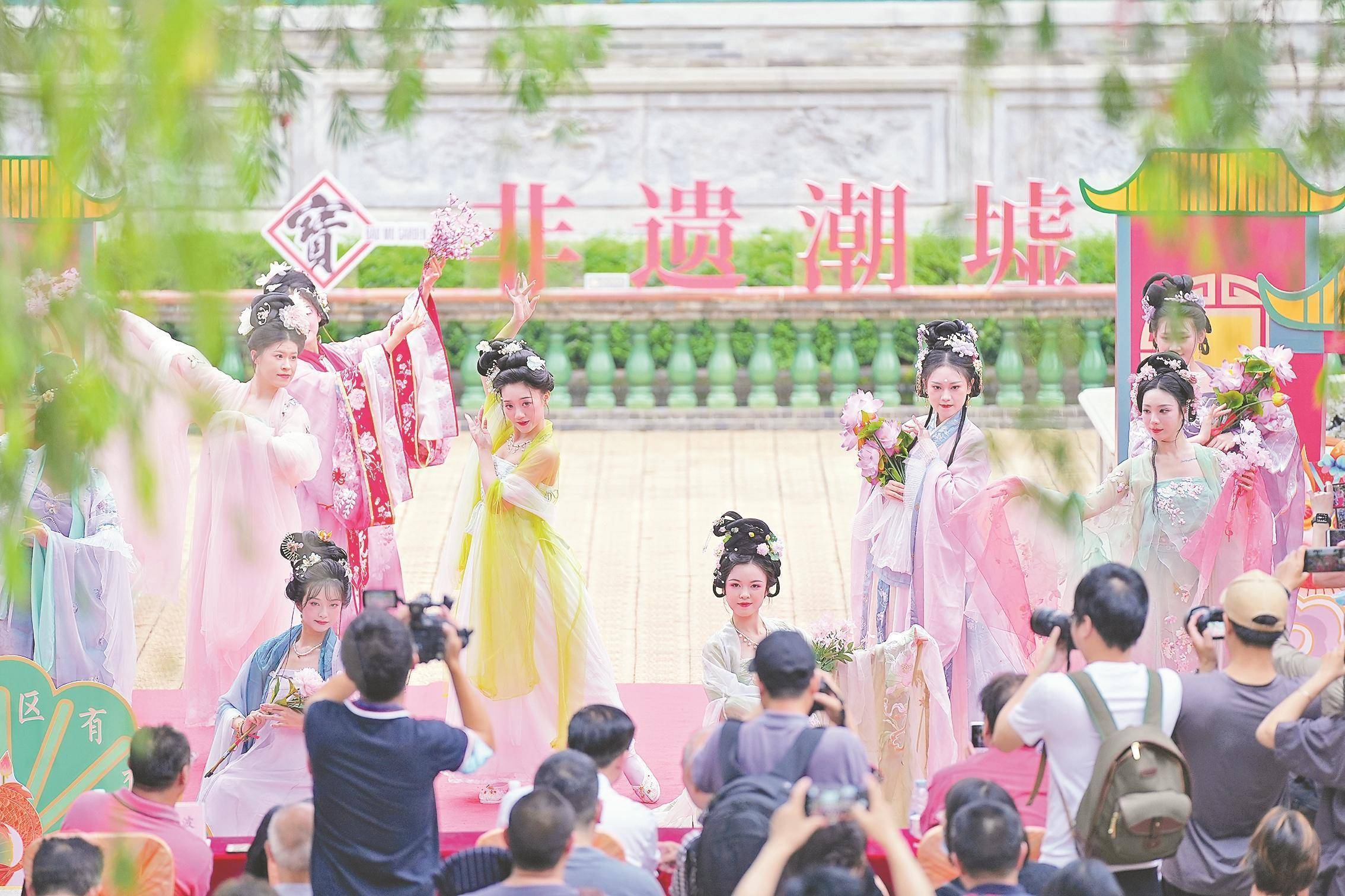 古风潮墟奇妙游活动现场设置了古风非遗潮墟区、VR元宇宙探索区、南国花船巡游区和1个主舞台紫洞舫船头展演区,将非遗文化、粤韵曲艺与潮玩艺术融于古典园林,续写千年前市集的包罗万象和市井繁荣的辉煌。