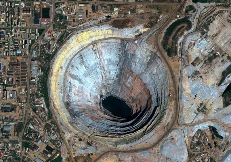 米尔内钻石矿是俄罗斯米尔内市境内的一座钻石矿,并且还是是世界最大的露天钻石矿坑之一。它的样子仿佛就像一个巨大的漩涡,据测量它的洞入口直径达1200米,深约525米,相当于161层楼那么高,从照片中就可以感受到它的恐怖。因为这个螺旋洞非常深,所以已使地球内部磁场与地表上空的空气形成强大气流,如果质量过轻的小型飞机飞过其上空,都能被这股气流吸进洞穴,非常恐怖。