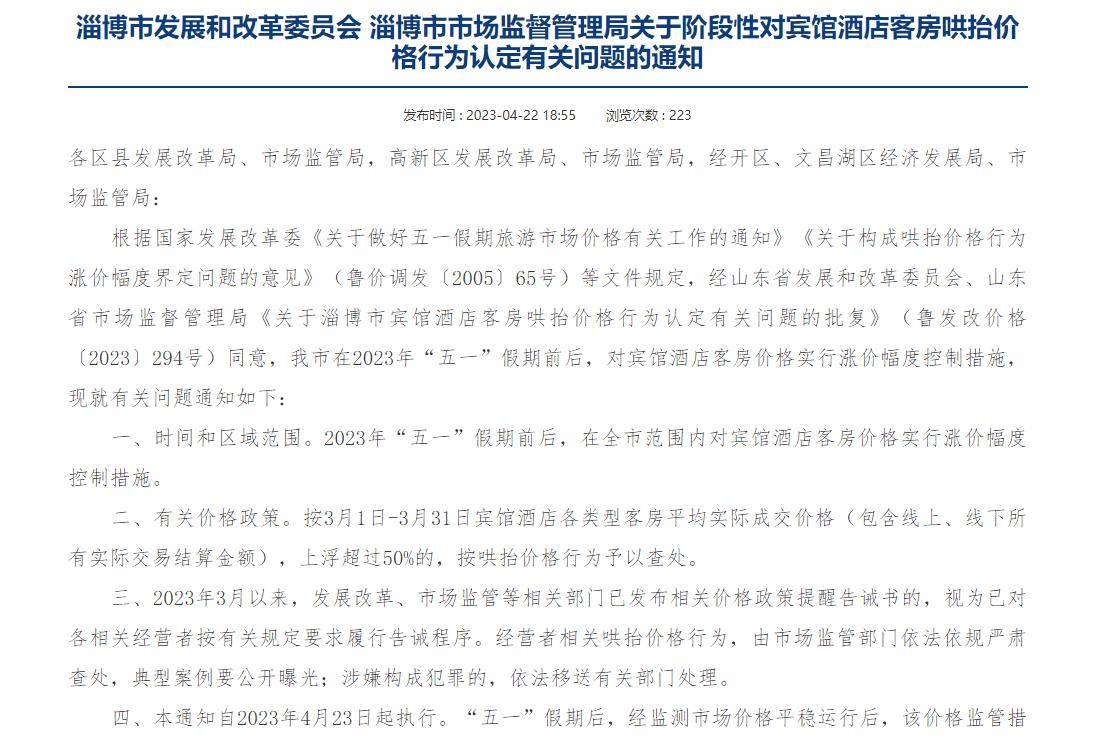4月21日,淄博发改委和市场监督管理局,下发了《关于阶段性对宾馆酒店客房哄抬价格行为认定有关问题的通知》,规定自4月23日起,对客房的价格涨幅进行管控,涨幅超过50%的按照鸿哄抬物价予以查处!