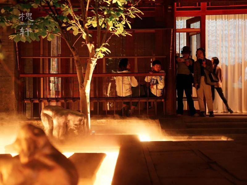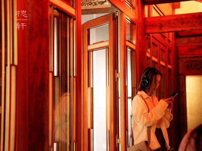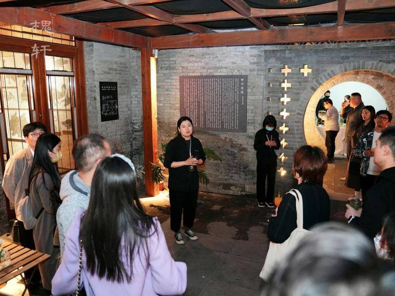 首场活动在槐轩开启。这里位于朝阳门商圈,原为俞平伯先生故居,现以艺术人文空间的状态对公众免费开放。此次活动线上招募活动参与者,征集了一批喜爱观展和音乐的市民参与。夜晚的槐轩经过特殊的灯光设计,柔和的光影效果区别于白天喧嚣之感。在宁静的四合院空间内,由音乐人现场为大家带来氛围音乐,引导观众带上耳机沉浸式观展。