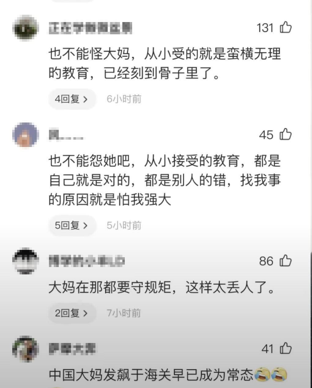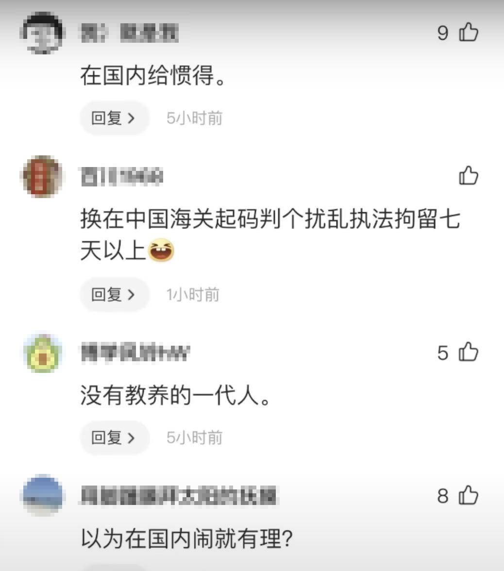 消息传回国内后有感于大妈们一贯在国内的表现,引起了网友们一边倒的谴责,主要谴责应尊重目的地法律法规,因为无论是中国海关还是国外海关,都会对携带肉制品、种子、植物等有各自的要求,任何执法机构都有权根据各国法律规定进行开箱检查并没收,情节严重的还可能触犯法律受到更严重的处罚。一旦遇到这样的情况,首先是配合检查,如果遇到语言障碍可以申请翻译人员帮助沟通,采取尖叫大闹撒泼躺地的国内做法实属丢人现眼的行为。