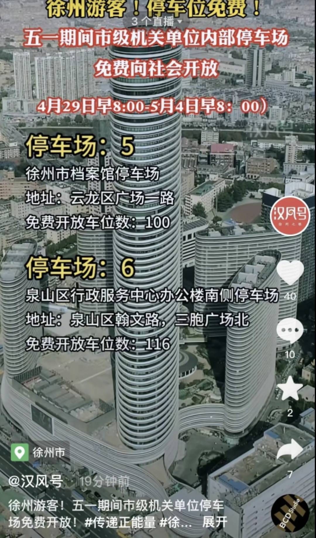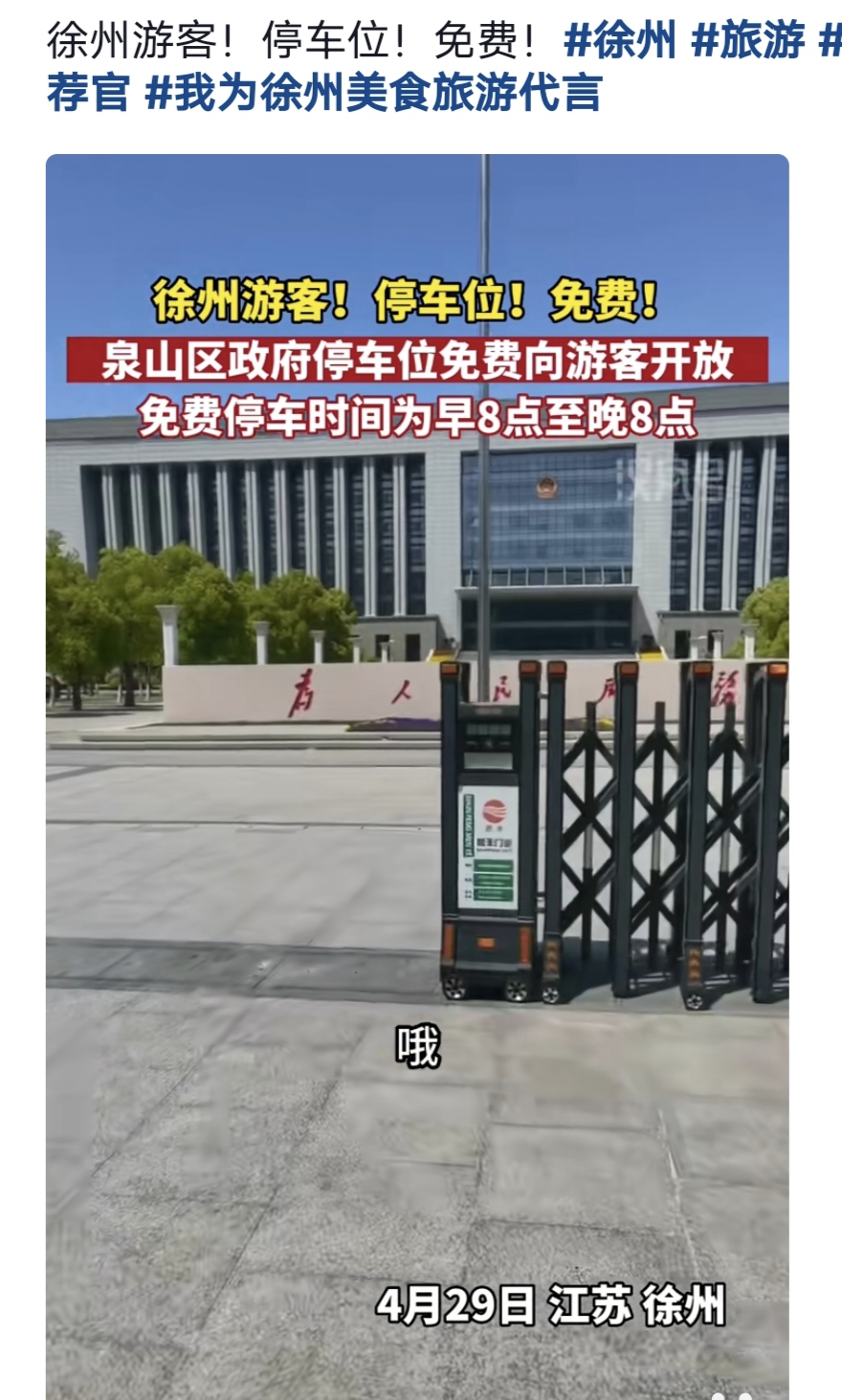 全市市级机关单位停车场,假期期间全部免费开放,从4.29号一直免费至假期结束。
