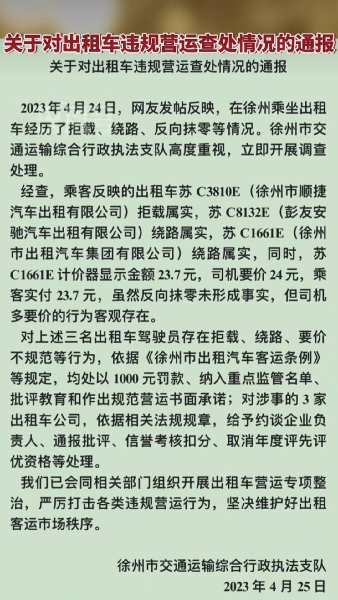 徐州交通运输综合行政执法支队对b太曝光的拒载绕路反向抹零情况在凌晨三点多及时回应。