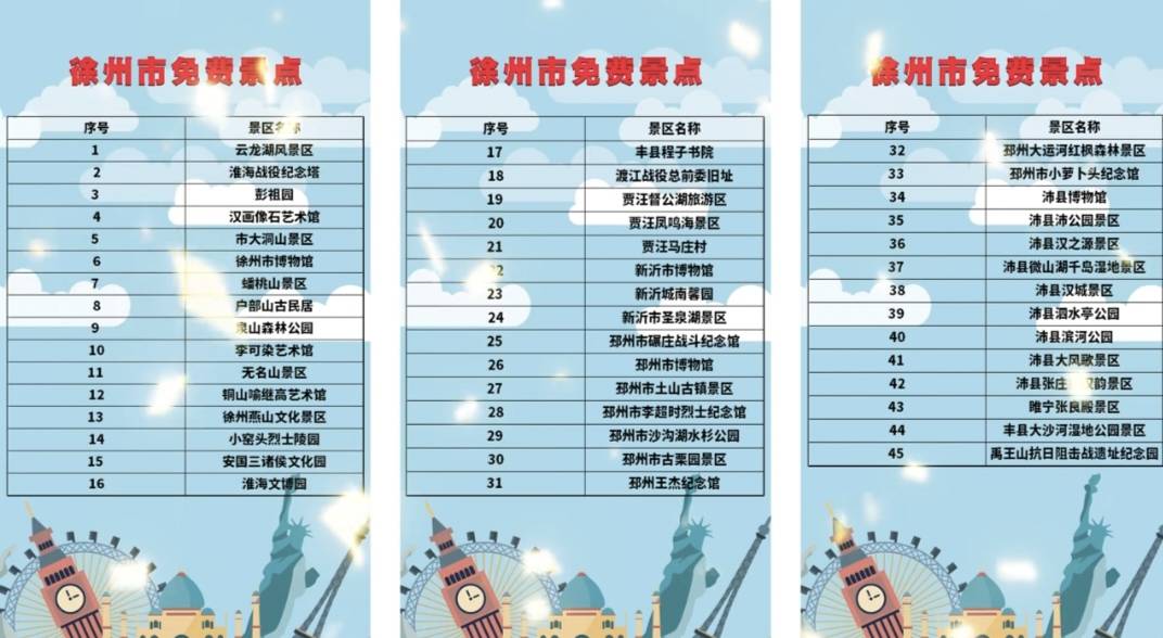 同时徐州众多景点免费开放,比如市区的淮海战役纪念馆,还有博物馆云龙山云龙湖等很多一直免费的景点,有的景点公交还免费接送。
