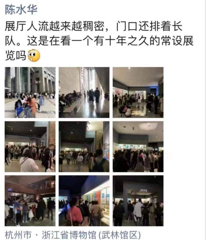 另一边,浙江省博物馆馆长陈水华在即将闭馆的浙博武林馆区也看到了相似的场景:展厅人流越来越稠密,门口还排着长队。值得一提的是,武林馆区目前只有一个有着十年之久的常设展在展出,但也吸引了如此数量可观的游客。