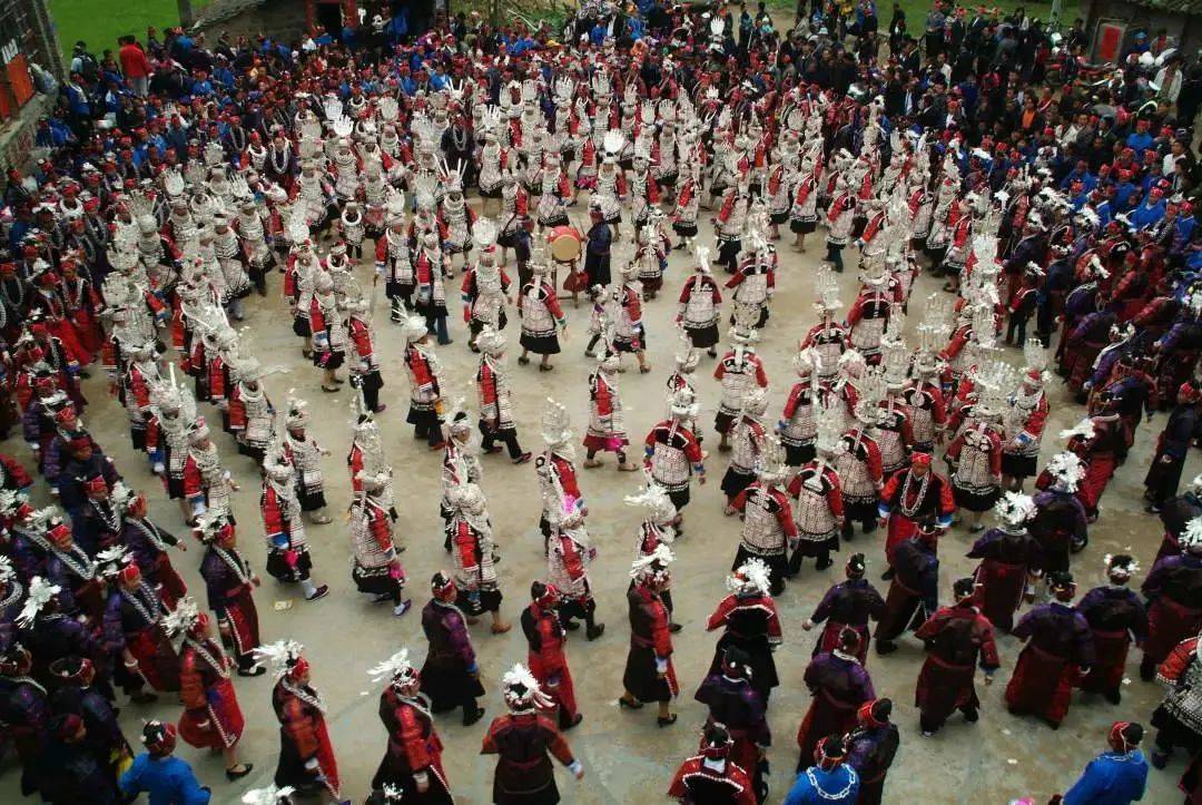 上千名苗族群众身着节日盛装欢聚在踩鼓场,参加姊妹节飞歌伴唱、千人盛装踩鼓活动,展示其苗族服饰及苗族民歌的魅力。