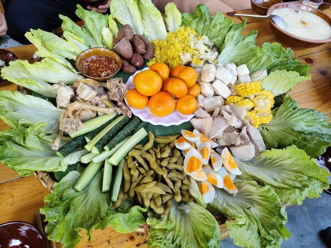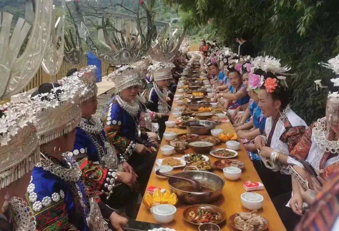 长桌宴是苗族宴席的最高形式与隆重礼仪。选用本地食材,让远道而来的客人亲自体验苗族的特色饮食文化。长桌宴宛如一条巨龙,让游客在感受千人共享美酒佳肴的同时,还能与当地苗族同胞互动对酒歌,欣赏当地美妙动听的芦笙演奏。活动共推出十多道苗族风味特色菜,如:五彩糯米饭、泡汤火锅等。