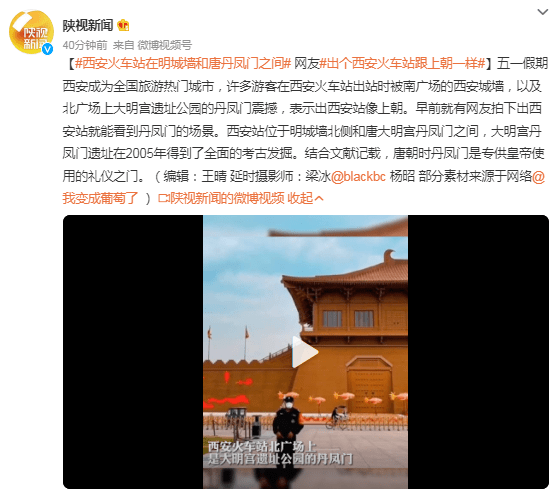 五一假期西安成为全国旅游热门城市,许多游客在西安火车站出站时被南广场的西安城墙,以及北广场上大明宫遗址公园的丹凤门震撼,表示出西安站像上朝。早前就有网友拍下出西安站就能看到丹凤门的场景。西安站位于明城墙北侧和唐大明宫丹凤门之间,大明宫丹凤门遗址在2005年得到了全面的考古发掘。结合文献记载,唐朝时丹凤门是专供皇帝使用的礼仪之门。
