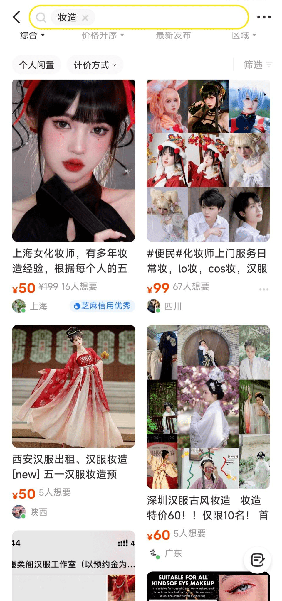 「摩登消费」通过闲鱼搜索关键词“旅拍摄影师”和“妆造”,出现很多独立摄影师和个人化妆师,价格只要百元。