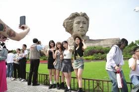 4月29日,长沙橘子洲景区,四位女孩在毛泽东青年艺术雕塑前合影。她们来自湖北,就读于同一所大学,去年毕业后因 故没有完成毕业旅行,这次相约来长沙旅游作为她们的毕业旅行。